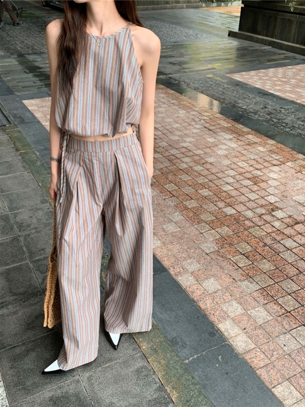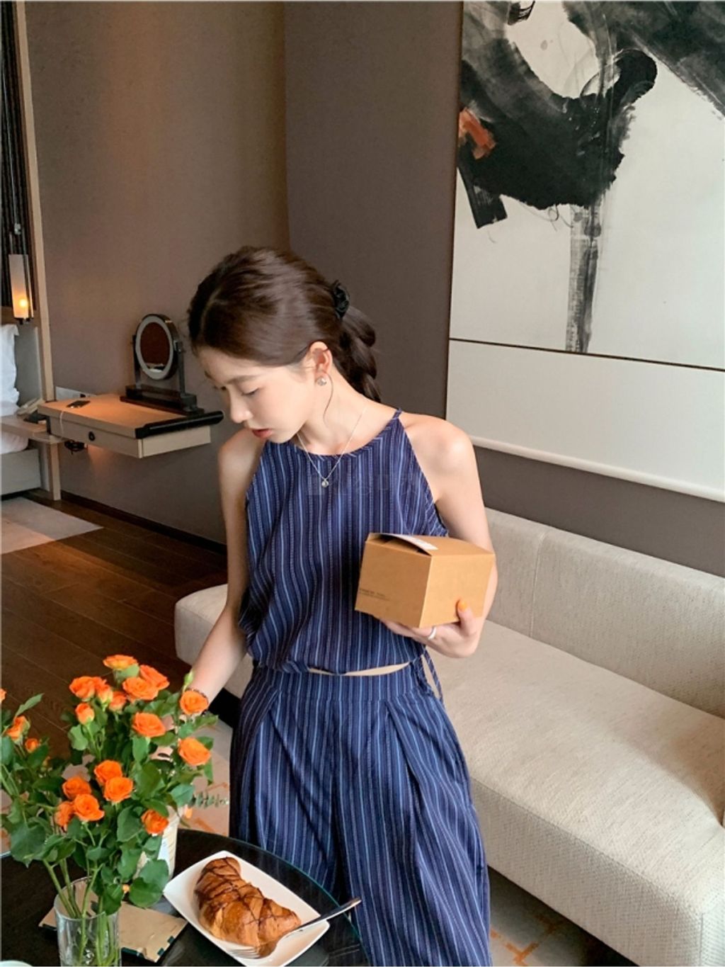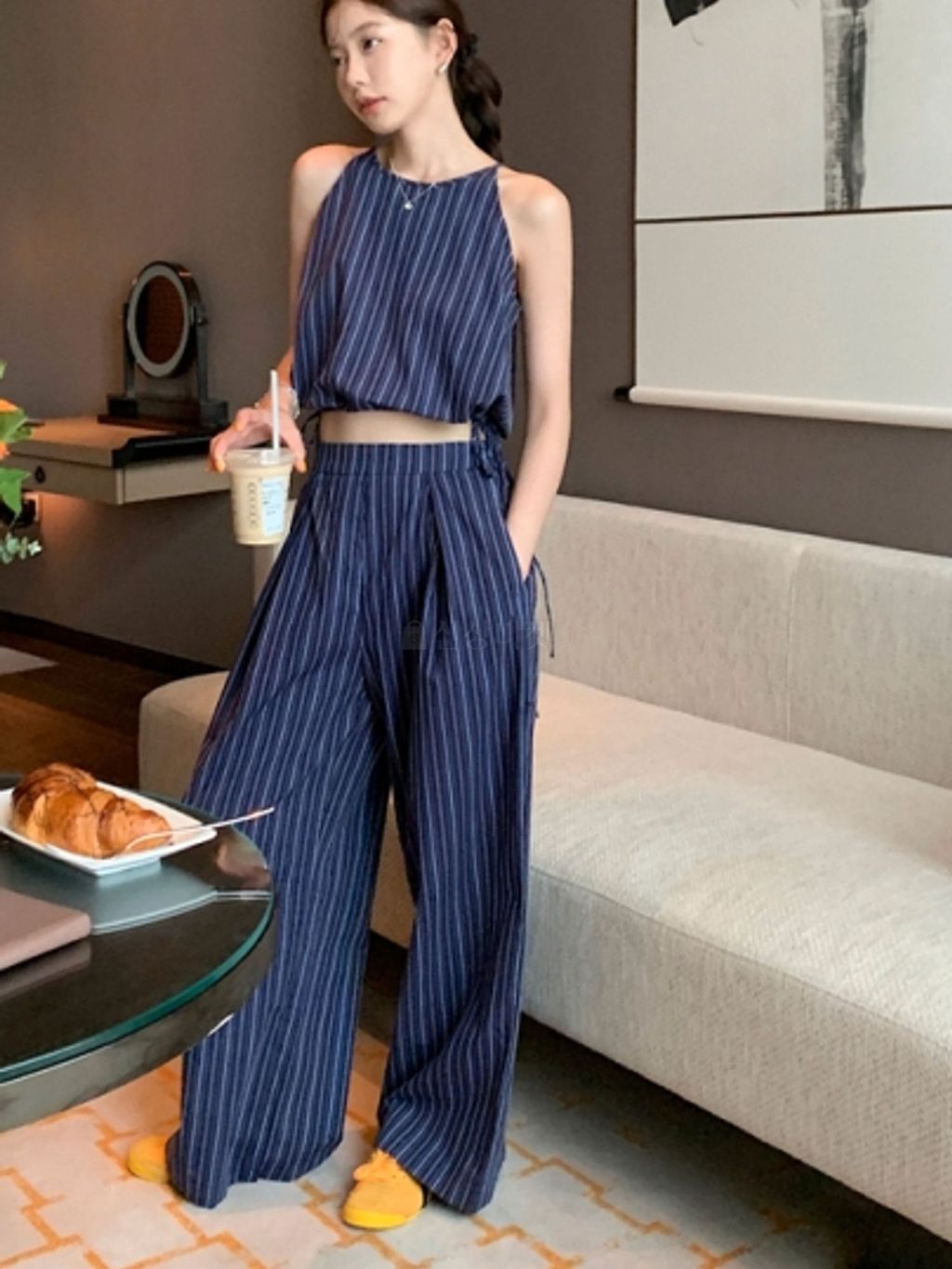 正韓削肩配色條紋上衣&長褲套裝 KGMTE