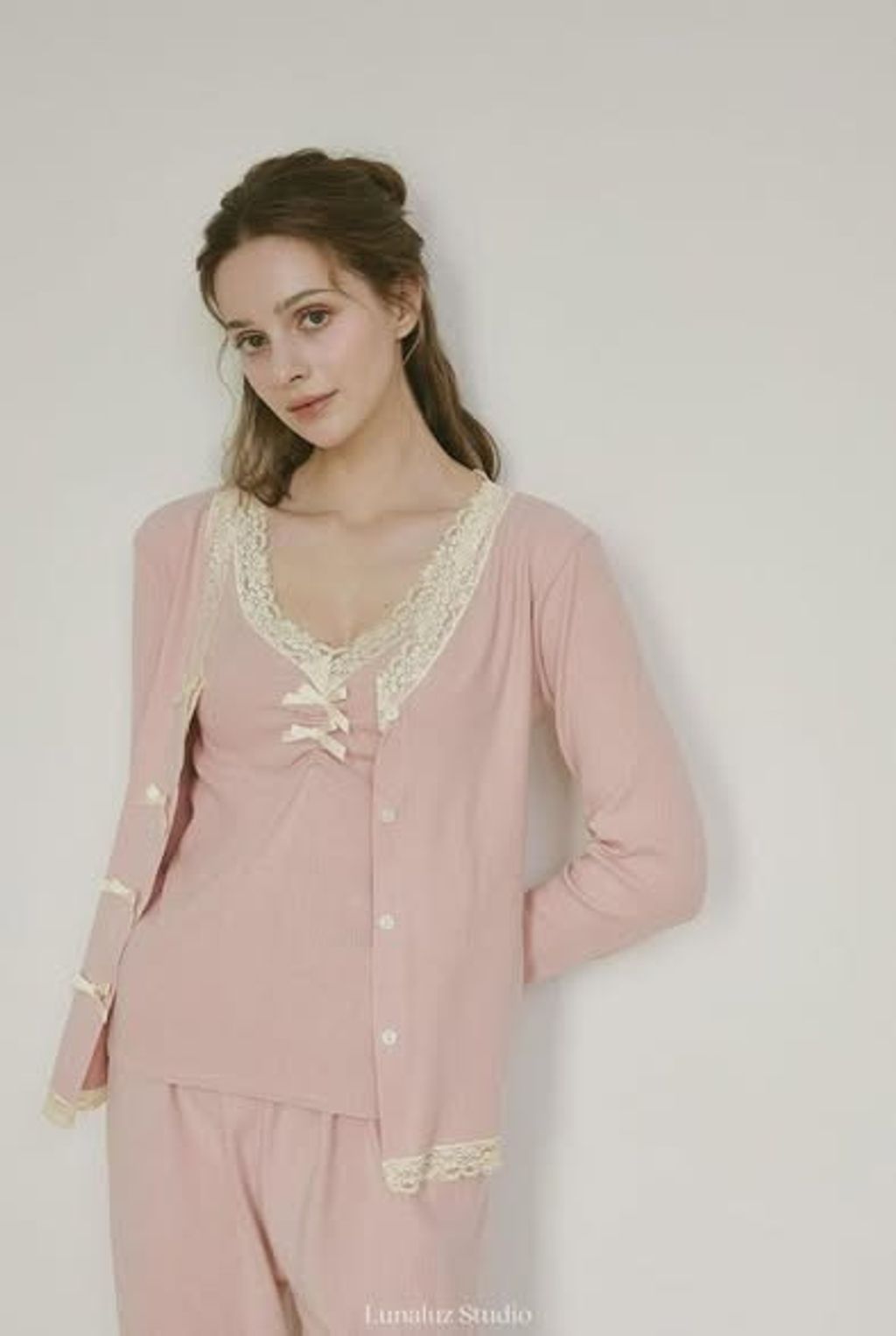 正韓蕾絲滾邊細肩帶上衣&長褲&罩衫三件套裝KGLUZ-1117