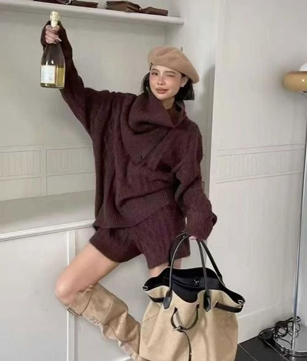 正韓麻花垂墜立領圍巾&圓領上衣&短褲套裝